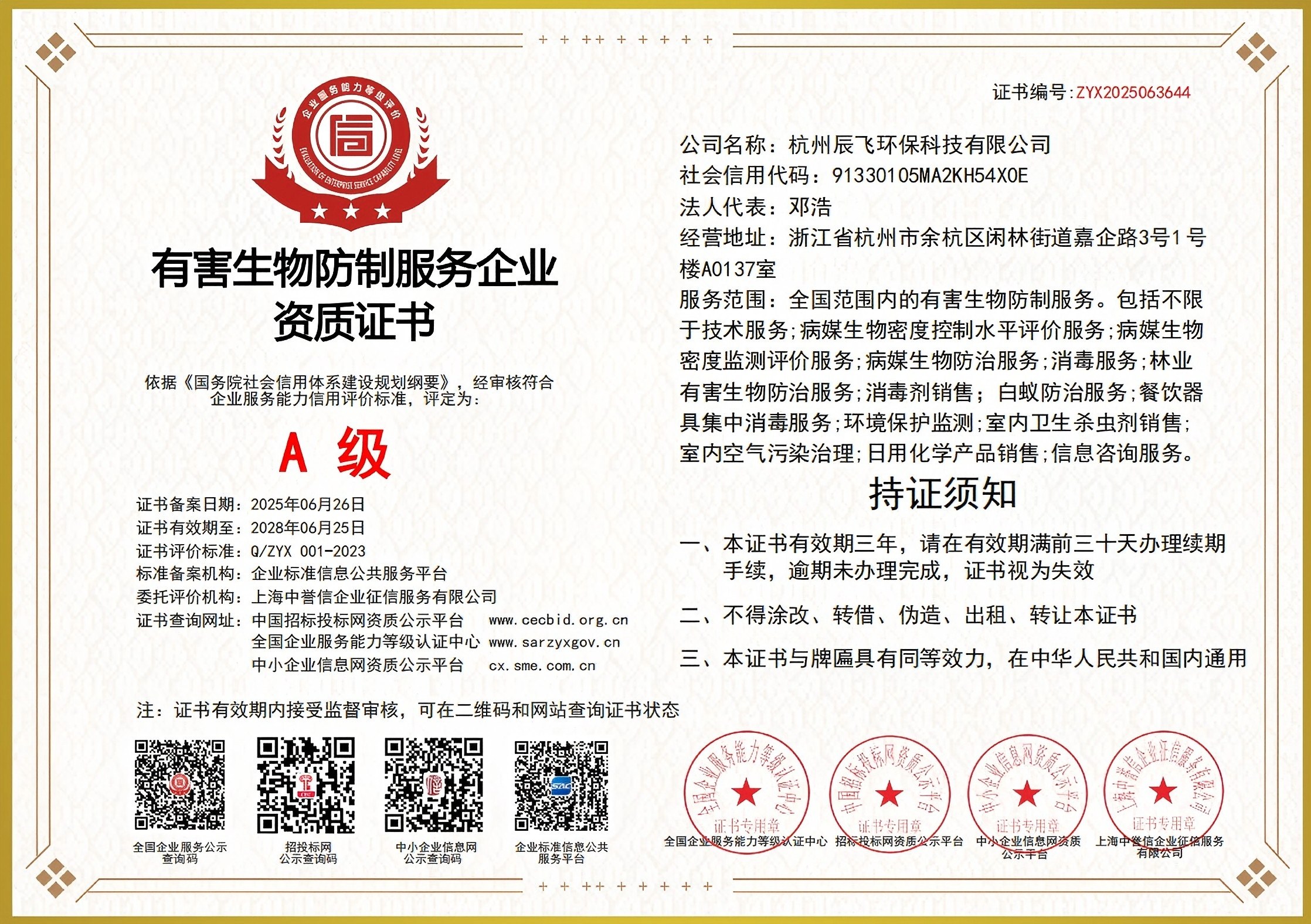 杭州辰飛環(huán)保科技有限公司是一家專業(yè)的PCO有害生物防治服務機構。是經杭州市工商局注冊登記、杭州市白蟻防治管理所、PCO協(xié)會批準的城市害蟲綜合治理消殺公司,是集除四害、白蟻消殺、除蟲、消毒殺菌、室內空氣污染治理、藥械銷售于一體的大型專業(yè)杭州有害生物防治科技有限公司。主要從事新建、擴建、改建、裝飾裝修單位建筑物的白蟻防治和白蟻預防工程,同時從事工廠、酒店、企事業(yè)單位、住宅小區(qū)和家庭的”四害”消殺和白蟻防治服務,長期向各類型客戶提供杭州白蟻消殺、除蟑螂、除老鼠、除蟲、消毒殺菌等優(yōu)質服務。 本公司自成立以來,秉承“誠信、敬業(yè)、高效、務實”的發(fā)展原則,以現(xiàn)...